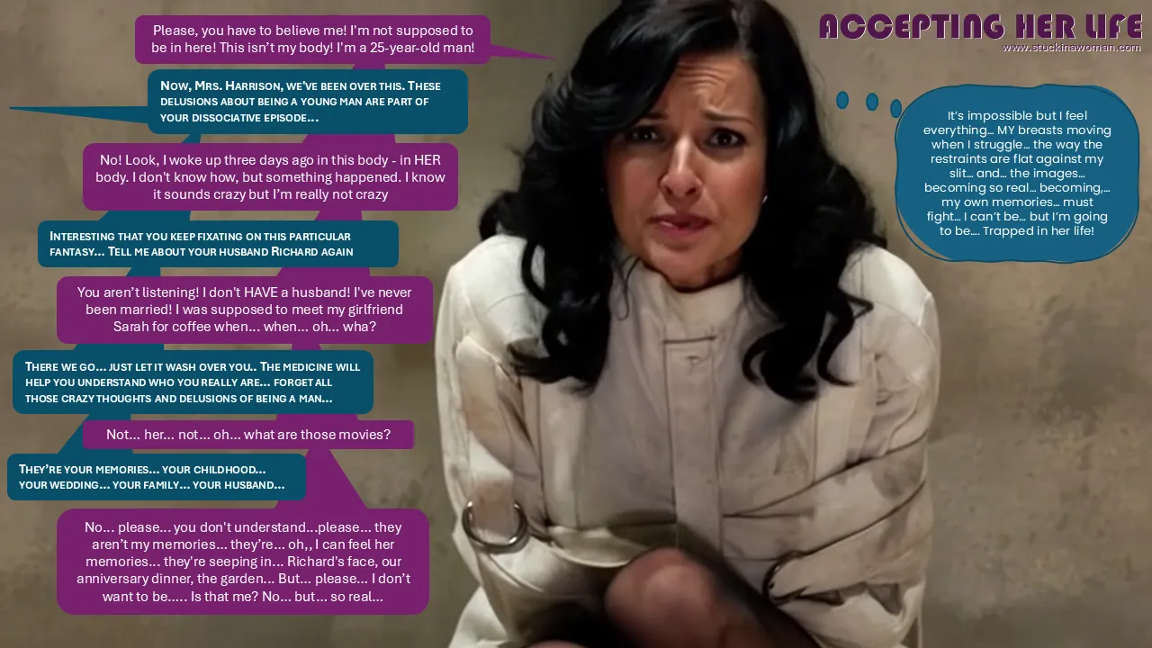 Trussed up in a straight jacket in a woman's body, It’s impossible but I feel everything… MY breasts moving when I struggle… the way the restraints are flat against my slit… and… the images… becoming so real… becoming,… my own memories… must fight… I can’t be… but I’m going to be…. Trapped in her life!