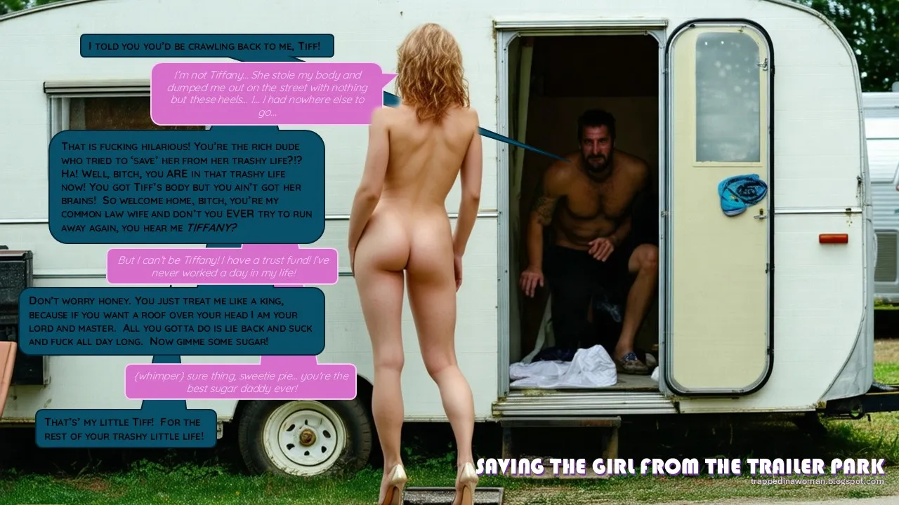 "That is fucking hilarious! You’re the rich dude who tried to ‘save’ her from her trashy life?!? Ha! Well, bitch, you ARE in that trashy life now! You got Tiff’s body but you ain’t got her brains! So welcome home, bitch, you’re my common law wife and don’t you EVER try to run away again, you hear me TIFFANY?"